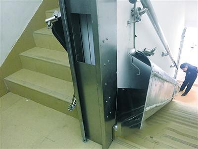 安裝電梯的居民樓位于八八中心·金廷小區(qū),樓高26層,每層有兩個單元。前日下午,記者在大樓底層消防通道內看到,滑梯全部收起,側掛在消防梯扶手上,銜接處有不銹鋼材質的金屬扣,滑梯本身為鋁合金材質。由于滑梯弧度不大,寬度在50厘米左右,因此收起后并未占據逃生通道過多空間。
